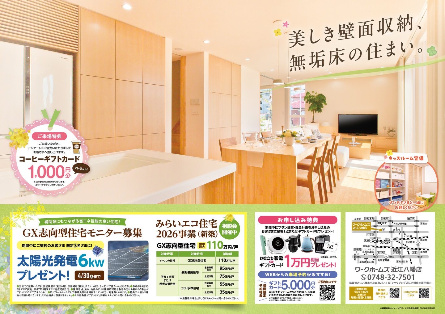 ●当社でご建築いただき、完成後展示(約2カ月)、広告掲載(雑誌、チラシ、WEB、SNS)にご協力いただける方。●2026年4⽉30⽇までのご契約、2027年3⽉末までに完成可能な⽅。●建築地域、法令、他条件により建築不可能な敷地の方はお断りする場合がございますのでご了承ください。●既にワークホームズと⼯事請負契約を締結されている⽅は対象外となります。●特典のお渡しは建物お引渡し時になります。その他特典は併⽤できません。●その他条件がございます。詳細はスタッフにお問い合わせください。
