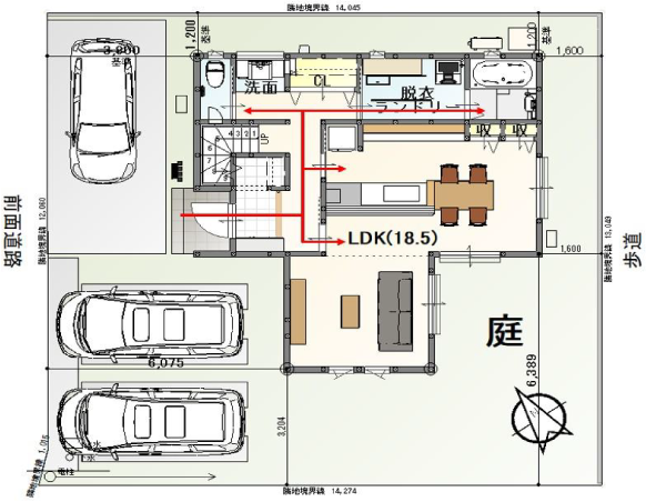 3SLDK、LDK18.5帖 南庭の日当たりの良い敷地です 駐車3台可能で来客時も安心! 南側に遊歩道があり、陽当たり良です