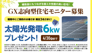 開催中〜4⽉30⽇(⽊)【ユニバ】みらいエコ住宅2026事業〈補助⾦相談会〉 【相談会開催中】GX志向型住宅 [補助⾦]110万円/⼾ ■期間中にご契約の限定10名さまにプレゼント! 【特典】太陽光発電6kW 【期間】2026年4⽉30⽇(⽊)まで ■諸条件 ●当社でご建… ユニバーサルホーム 長浜店 南彦根店 八日市店 津店 開催中【ビギンズの家】〈完全予約制〉建売住宅2邸⾒学会 ビギンズの家 近江八幡店 建売物件情報LDK家具付きで新生活スタート ワークホームズ 不動産部 開催中〜4⽉30⽇(⽊)【ビギンズの家】GX志向型住宅モニター募集 ビギンズの家 近江八幡店