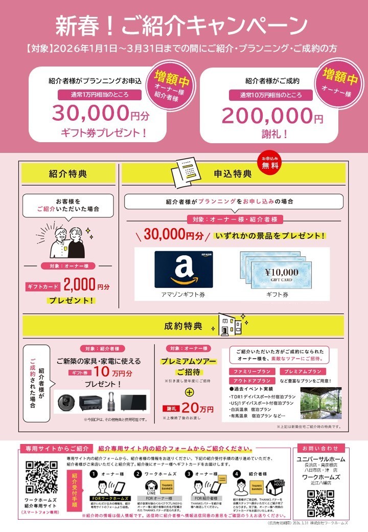 弊社では、より多くの方にワークホームズ・ユニバーサルホームを知っていただくため、『オーナー様からのご紹介キャンペーン』を実施しております。